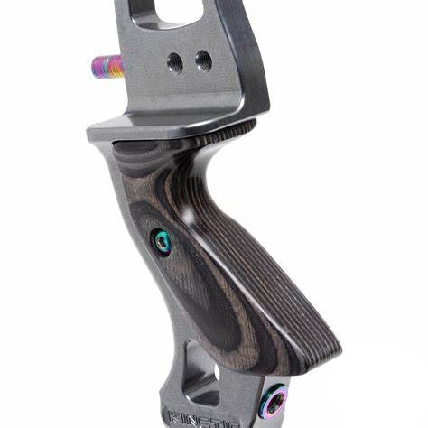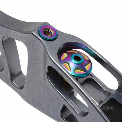 Cada una de los riser de 23, 25 o 27 pulgadas está disponible en diferentes colores llamativos, de los cuales los colores Chameleon y Spectra son particularmente impresionantes con su extraordinario juego de colores. El grip del riser es de madera a juego con el color complementando el aspecto y al mismo tiempo garantiza una sensación agradable cuando se sostiene en la mano. Sin embargo, el aspecto del riser Sovren todavía tiene un pequeño detalle reservado: los tornillos Tiller, el extensor del clicker, los tornillos y los casquillos roscados están anodizados en el llamado color Oil Slick. Esto los hace brillar como una película de aceite en diferentes colores.