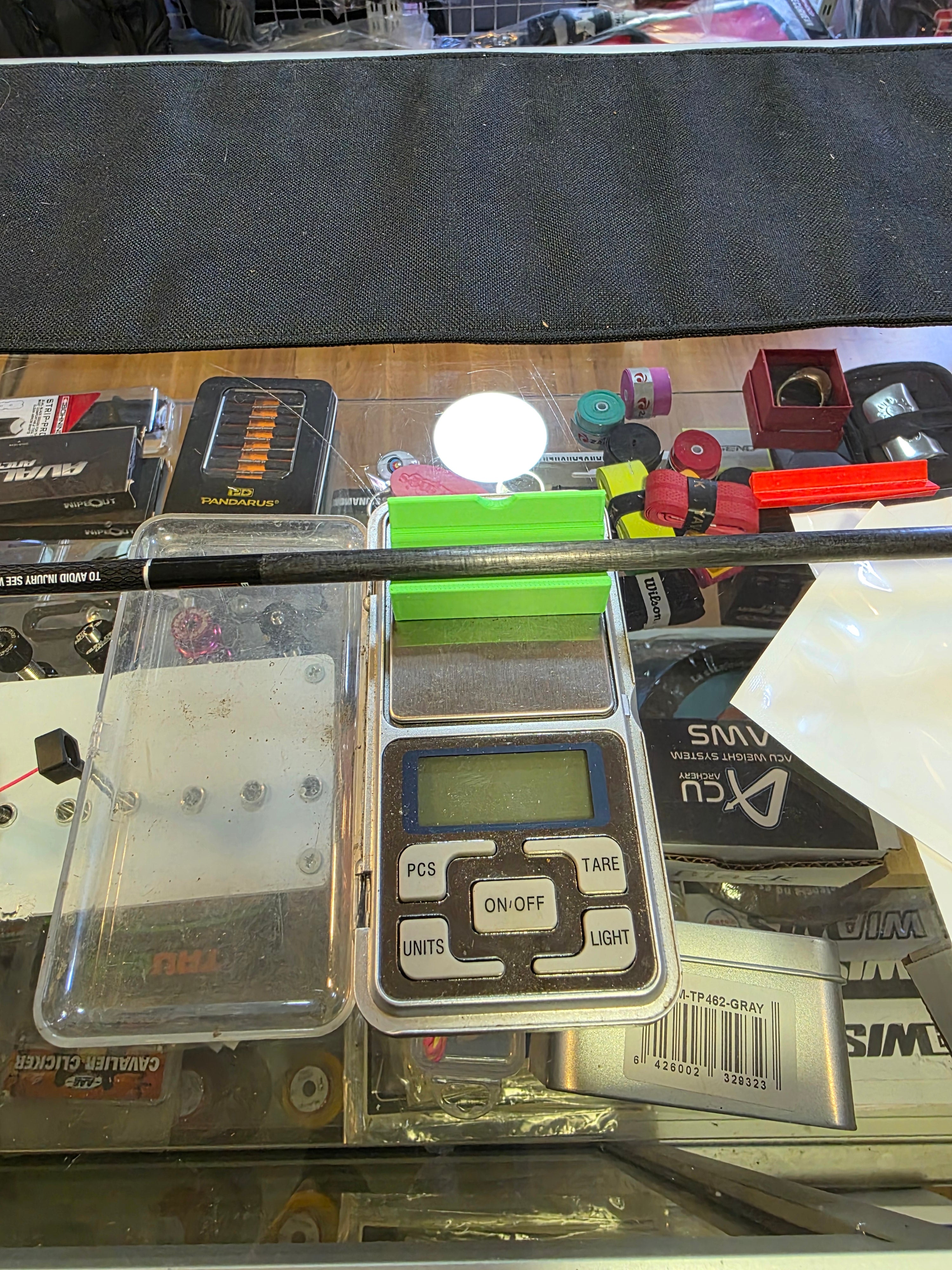 Soporte de flecha para balanza que mantiene tu flecha estable durante la medición. Disponible en dos versiones: modelo con ajuste de FOC (Forward of Center) para precisión avanzada y el modelo básico para sujeción simple.